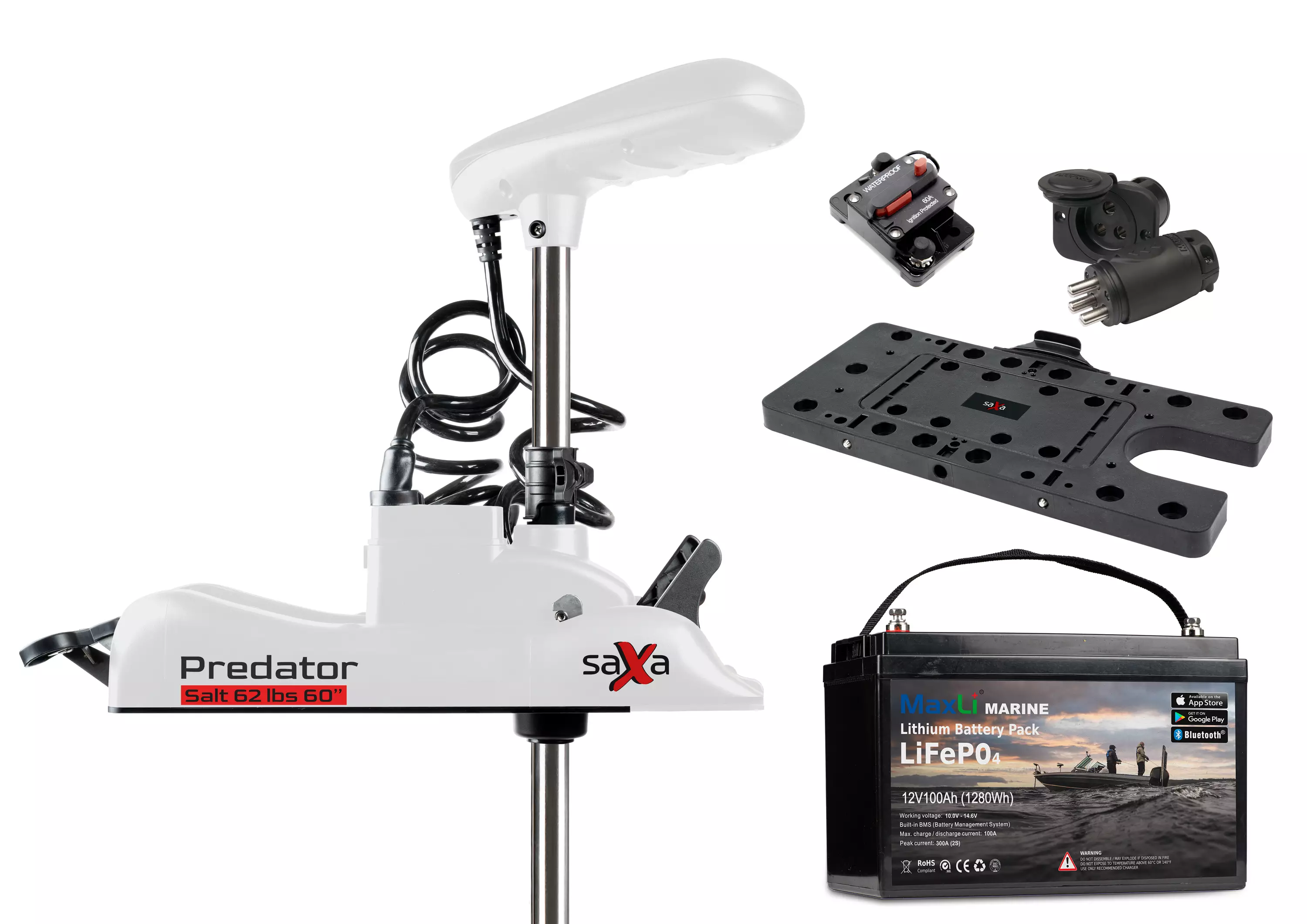 Saxa Predator Salt 62lbs 60'' + MaxLi Lithium er den perfekte pakke med en bovmonteret elmotor designet til brug i saltvand. Denne pakke indeholder den kraftfulde Saxa Predator Salt bovmonterede elmotor, det lette og holdbare MaxLi Marine lithiumbatteri, Saxa Predator Quick Release Bracket hurtigbeslag, en 60A vandtæt automatsikring samt Marinco's kvalitetsstrømstik.