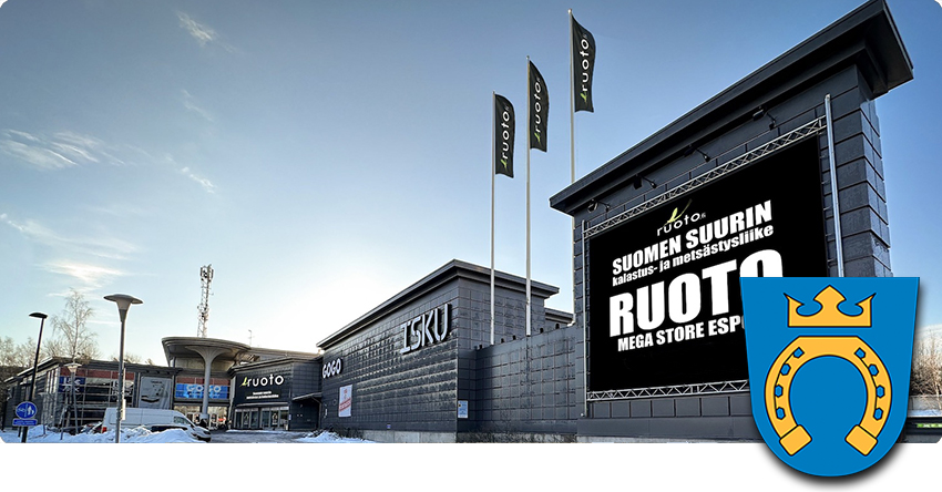 Ruoto Mega Store Esbo er vores nyeste butik, som slog dørene op i maj 2023. Vores flotte, nye butik i Esbo repræsenterer spydspidsen blandt Ruoto-butikkerne og rummer hele vores velkendte produktsortiment. Den cirka 1.000 kvadratmeter store helhed betjener sine kunder på en fremragende placering i Finno 7 dage om ugen.