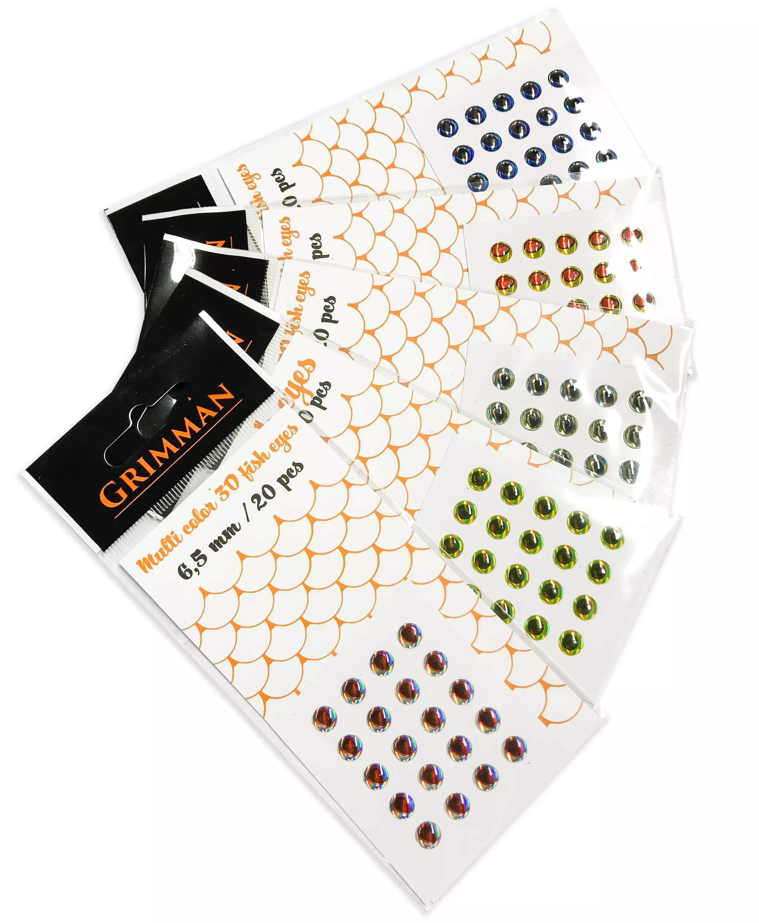 Grimman 3D Fish Eye -klisterøjne fås i seks forskellige størrelser. Størrelserne er 3,5, 5, 6,5, 8, 10 og 12 millimeter i diameter. Pakken indeholder 20 klisterøjne. Dette produkt er 6,5 mm i størrelse.