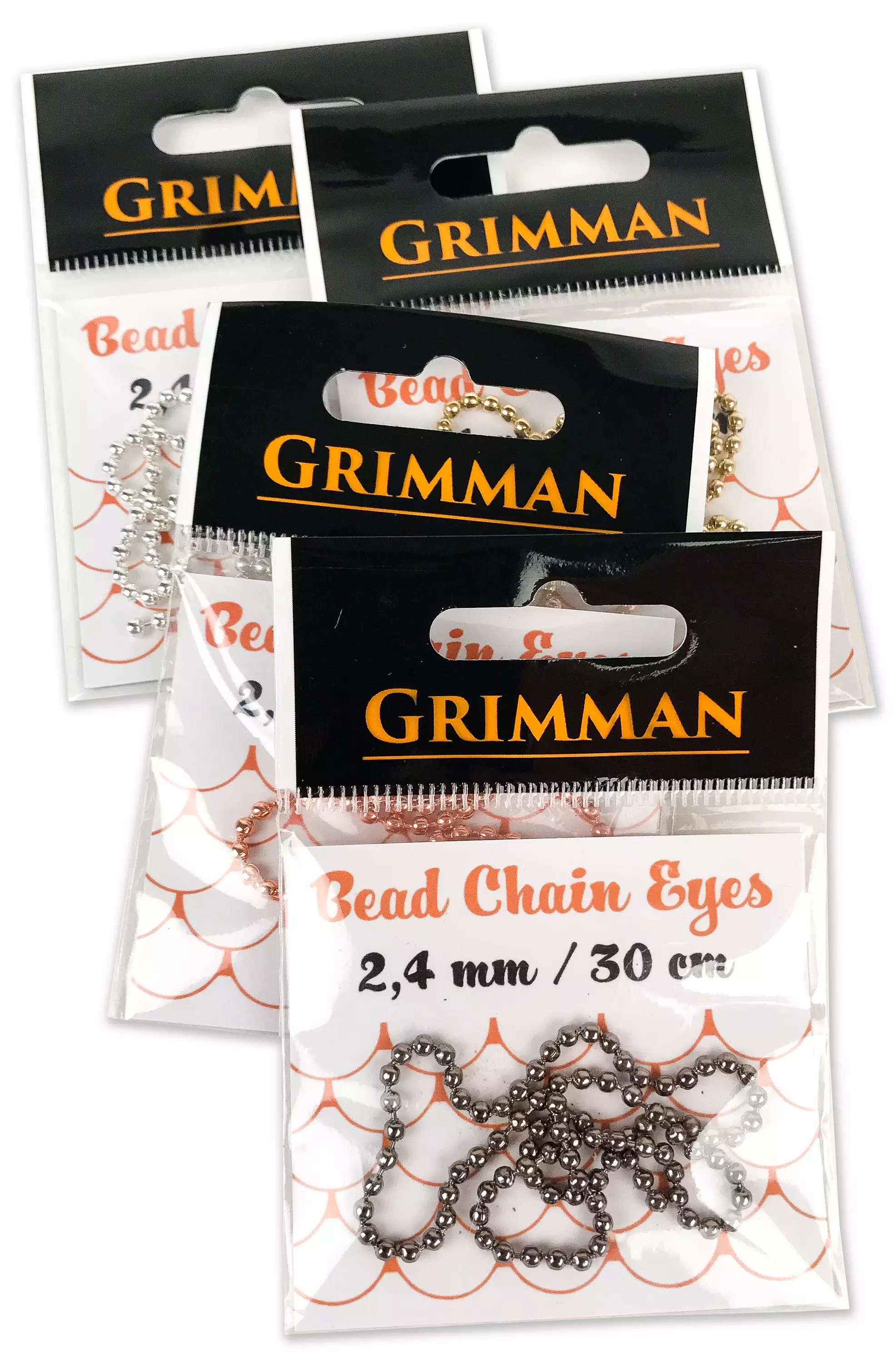 Grimman Bead Chain Eyes er Grimman's version af kuglekæden. Fås både i metalfarver og i meget klare malede fluorescerende farver. Med de tre tilgængelige størrelser kan du vælge den, der passer bedst til dit behov. Pakken indeholder cirka 30 centimeter kuglekæde. Materiale: messing.