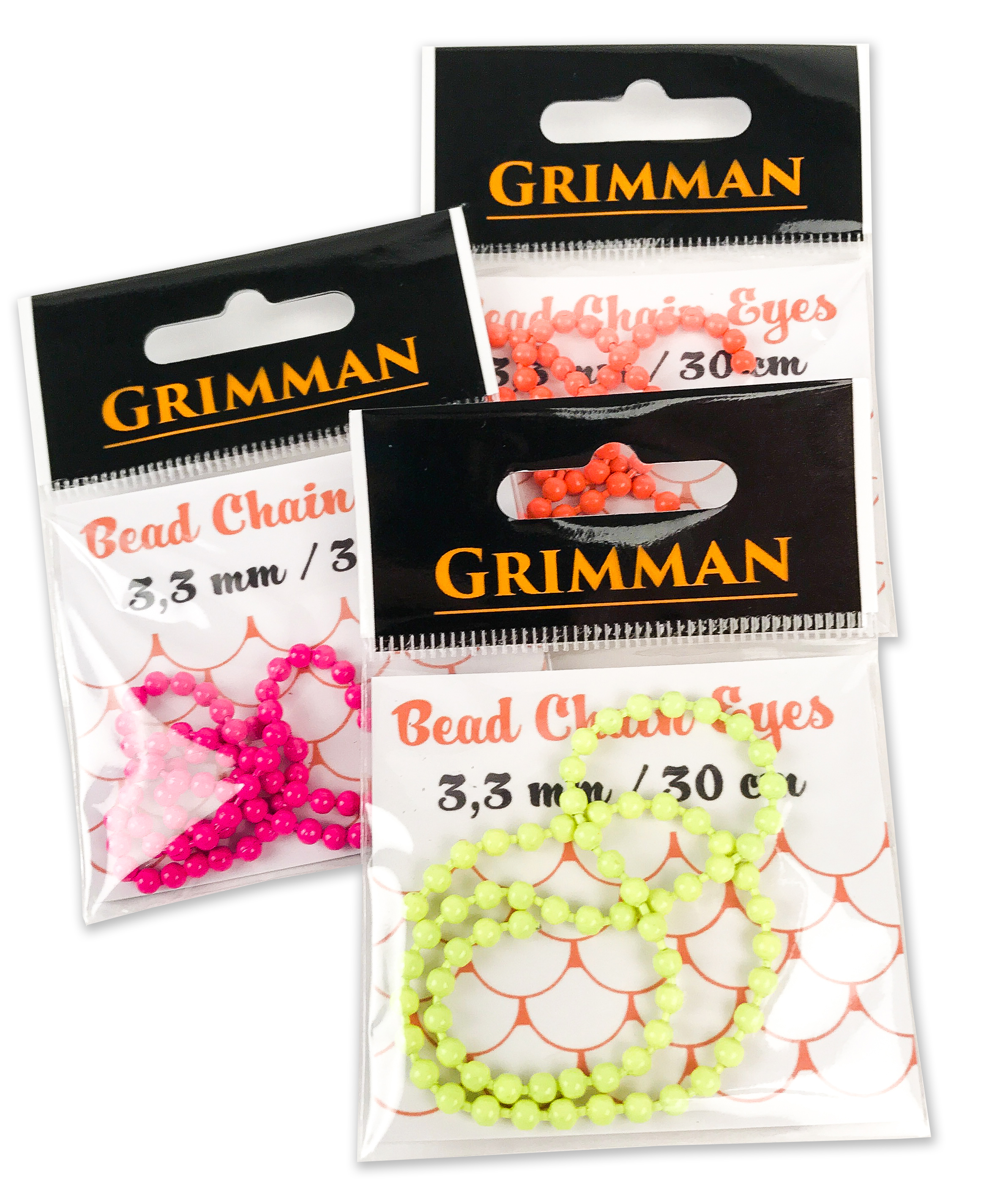 Grimman Bead Chain Eyes er Grimman's version af kuglekæden. Fås både i metalfarver og i meget klare malede fluorescerende farver. Med de tre tilgængelige størrelser kan du vælge den, der passer bedst til dit behov. Pakken indeholder cirka 30 centimeter kuglekæde. Materiale: messing.