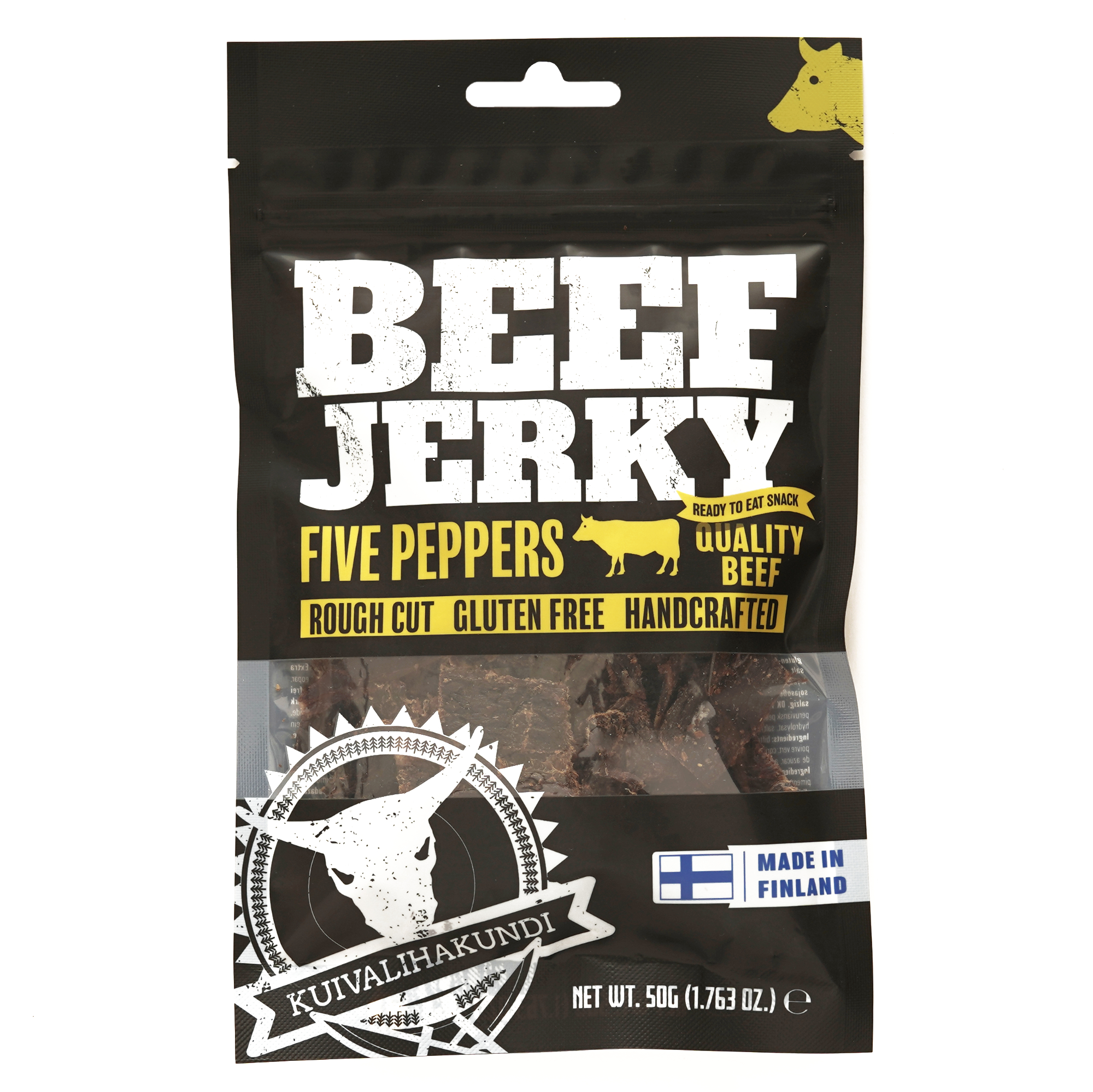 Kuivalihakundi Beef Jerky Five Peppers er en pose med lokal tørret kød med peber – masser af energi i en kompakt pakke. Krydringen indeholder fem forskellige pebertyper og koriander. Rig på protein, med en blød pebersmag. 150g pose med lokalt produceret beef jerky krydret med peber og koriander! Perfekt til at krydre mad på ture, tilsæt det til maden fra starten, så det tørrede kød kan blødgøre under madlavningen. Produktet indeholder en fempeber-blanding samt et strejf af koriander. En 150g pakke tørret kød indeholder cirka 550kcal og hele 75g protein, hvilket gør det til en fremragende snack til lange sportsaktiviteter, vandreture eller daglige gåture. Tørret kød kræver ikke kølig opbevaring, så du kan trygt opbevare produktet ved stuetemperatur, selv efter åbning.