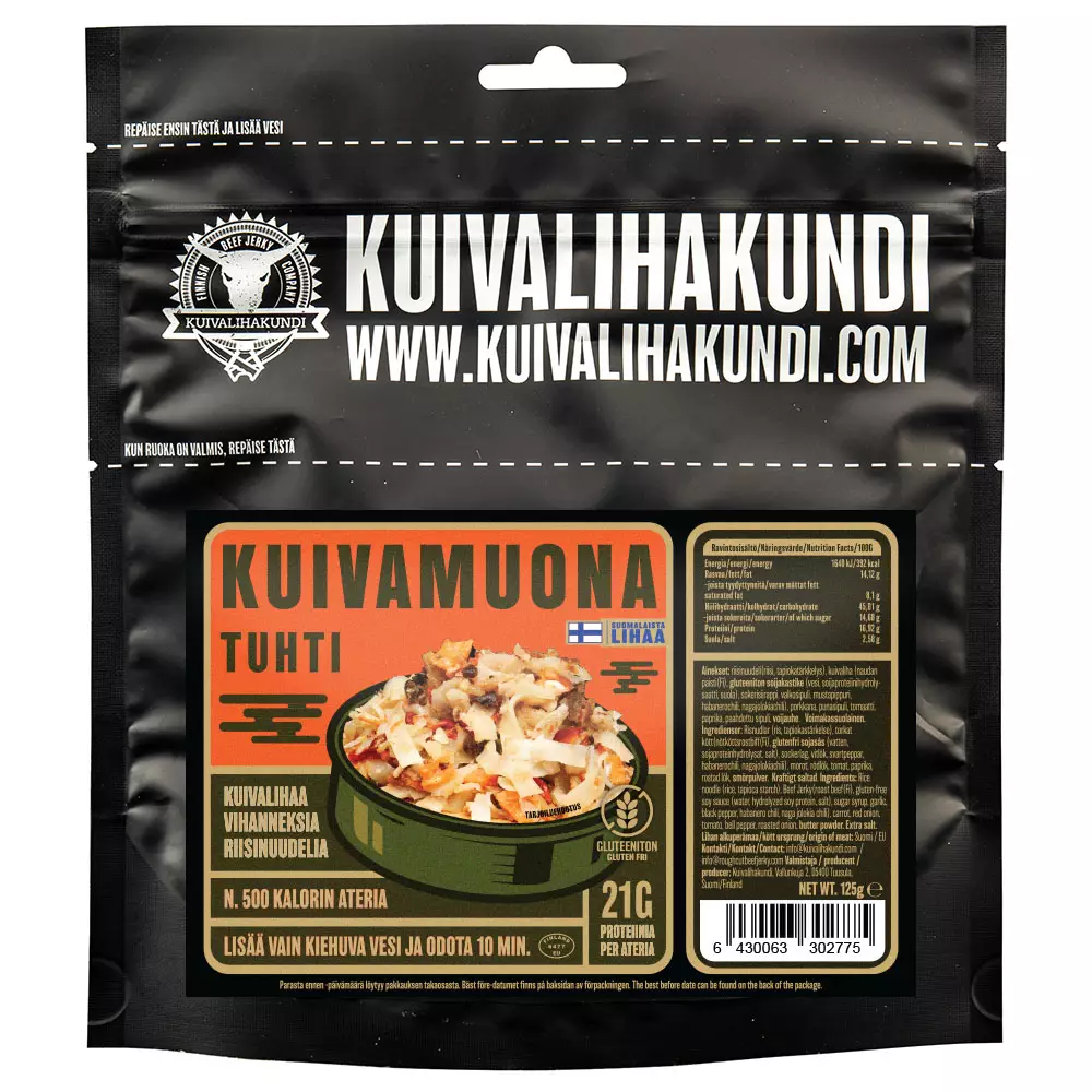 Kuivalihakundi Tørmad Tuhti 125g er det perfekte valg til den krævende smag. Dette færdigret er specielt designet til udendørsaktiviteter og vandreture, og tilbyder masser af protein og energi. Tuhti indeholder 24g protein og 500 kcal energi pr. portion, hvilket gør det til en fremragende energikilde til langvarige aktiviteter.