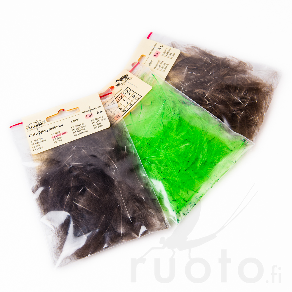 Marc Petitjean CDC -fjer er fjer af højeste kvalitet og nøje udvalgt, specielt designet til fluebinding. CDC-fjer (Cul de Canard) stammer fra bunden af en ands fedtkirtel, hvilket giver dem en naturlig vandafvisende egenskab. Denne egenskab gør dem til et meget populært materiale til tørfluer og moderne nymfer.
