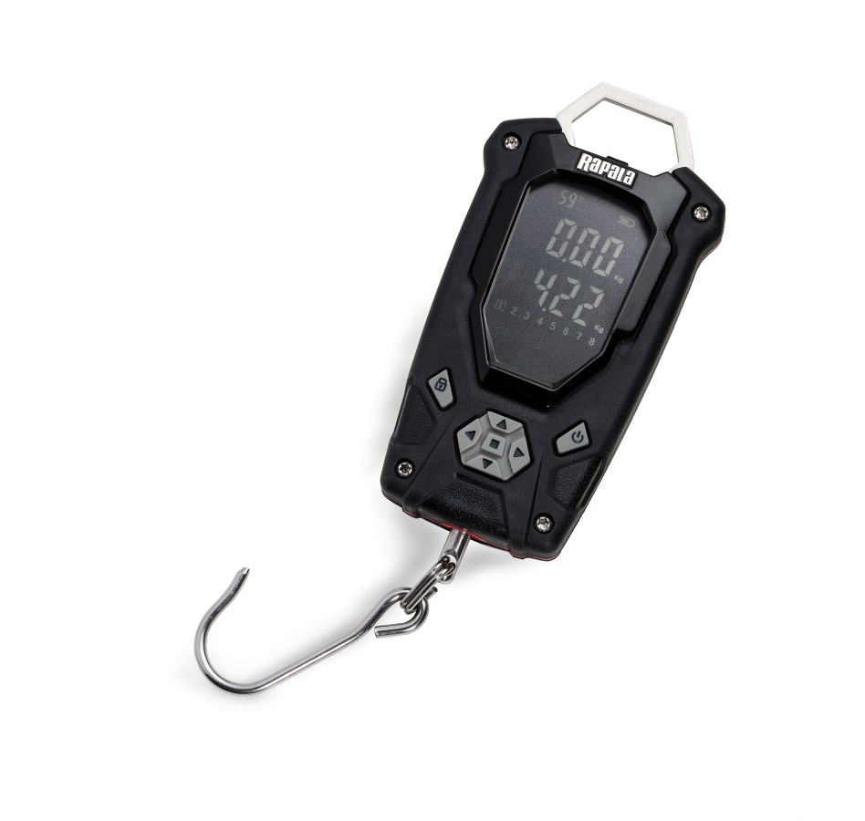 Rapala RCD Digital Scale -fiskeskala. Robust konstruktion, præcise resultater over hele måleområdet, stor tydelig skærm og temperaturmåling er kendetegnene for en god fiskeskala - Rapala RCD Digital-skalaen er netop sådan. Rapala RCD digitale skala har 8 hukommelsespladser, hvor fiskens vægt kan gemmes. Derudover viser skalaen den mindste og største måleresultat samt den samlede vægt. Ved at bruge hukommelsesfunktionen og den store skærm kan du også tage bedre og mere alsidige billeder. Den robuste Rapala RCD 25 kg Digital-skala passer i hånden. Ergonomien og slagfastheden forbedres af Soft Grip-belægningen.