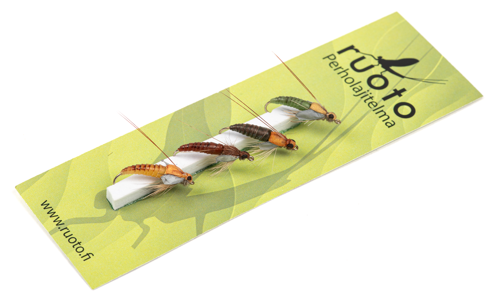 Ruoto Fluesæt Realistiske vårfluepupper er et fluesæt, der indeholder realistiske imitationer af vårfluepupper. Dette sæt er designet til brug specielt under vårflueklækninger. Pakken indeholder fire fluer, der imiterer vårfluepupper. Disse fluer bruges i fluefiskeri til at tiltrække fisk, der spiser vårfluepupper.