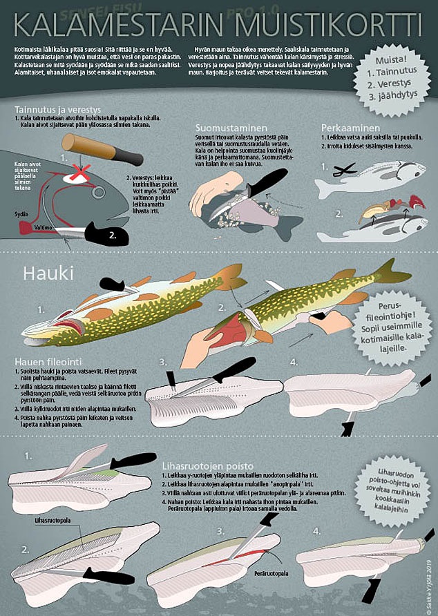 Sakke Yrjöläs Fiskemesterens "hukommelseskort" er en A4-størrelse fisketavle, der tilbyder information og skønhed i en kompakt form. Kortet er trykt i Finland på lokalt produceret 300g kortkarton og har en beskyttende lak. Dets dimensioner er cirka 21 x 30 cm. Kortet er velegnet til indramning som en tavle eller til at sende som postkort.
