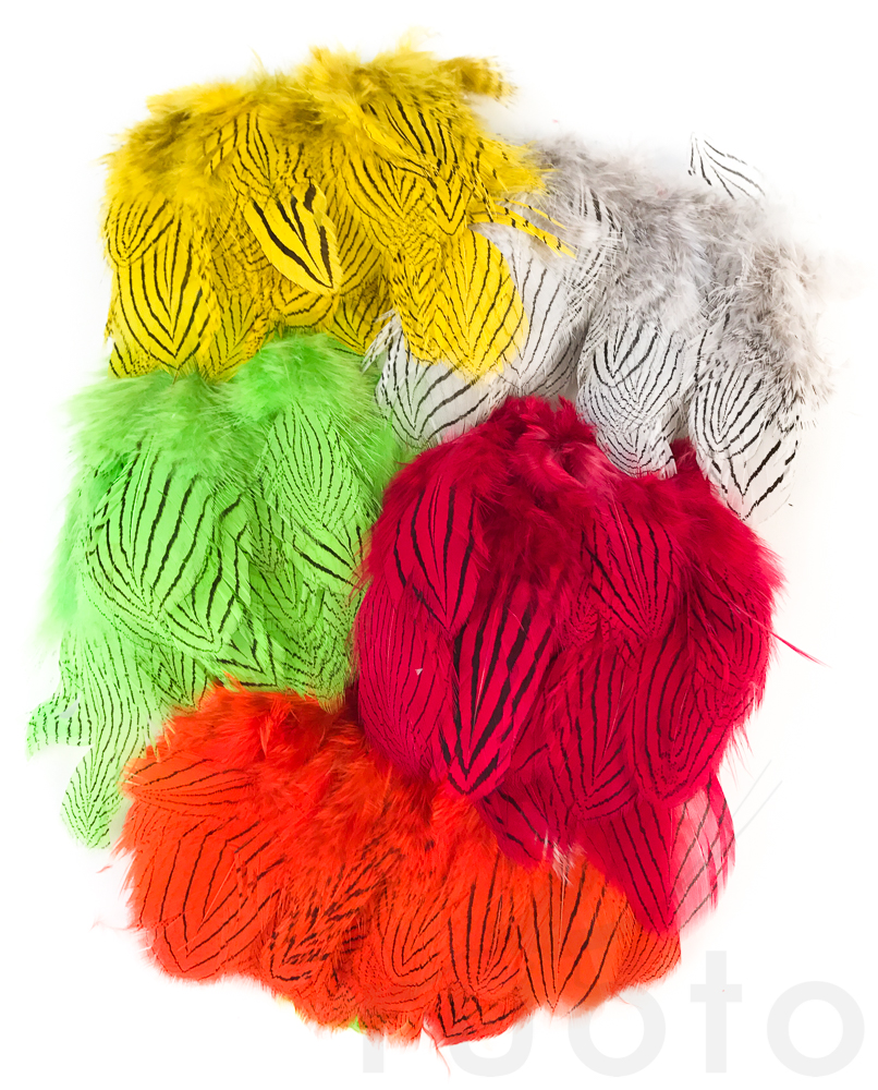 Hareline Silver Pheasant Body Feathers - sølvfasanens kropsfjer bruges primært til kinderne på klassiske streamere. De kan dog også erstatte hanenakken på laksefluer, da sølvfasan som hackle er et meget levende materiale, og de sorte striber gør det mere naturtro. Sølvfasan er også fremragende som hackle til rørfluer og for eksempel som hale til nymfer og tørfluer på grund af de lange fibre.
