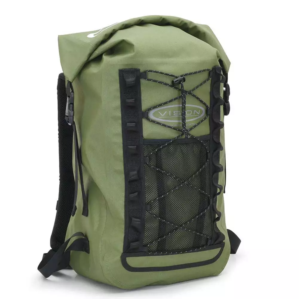 Vision Aqua Day Pack 35L Olive – vandtæt rygsæk, der er designet til at holde dit udstyr tørt under fisketure eller andre udendørsaktiviteter. Rygsækken har en kapacitet på 35 liter og er lavet af holdbart PU-belagt nylon.