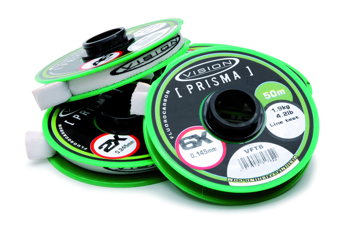 Vision Prisma Fluorocarbon - forfangslinen fås i tykkelser fra 0X til 7X i 50 m spoler. 0,31 mm - 0,52 mm fås i 30 m spoler.