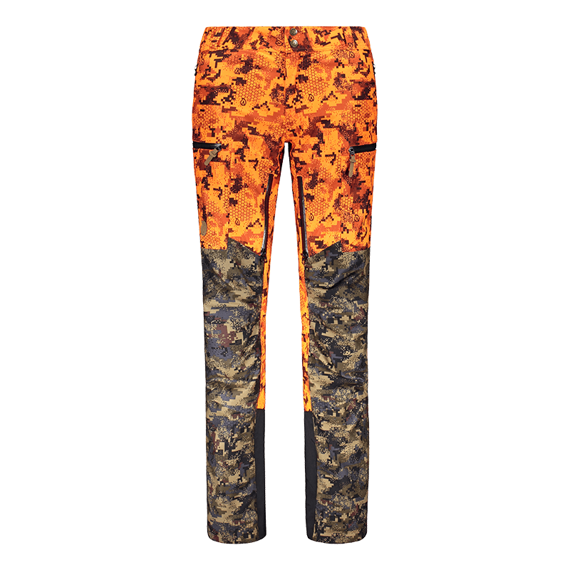 Anar Hirvas W's Hunting Trouser er resultatet af samarbejdet mellem en finsk topdesigner og en dygtig modelmester, som har skabt bukser, der ikke efterlader noget at ønske! Jagtbukserne er designet til finsk elg- og hjortejagt. Overfladematerialet er meget stille og slidstærkt børstet polyester. Farven og mønstrene er designet til at camouflere jægeren fra dyrets syn. Den klare orange farve opfylder de nyeste lovkrav. Disse egenskaber er meget velegnede til både post- og pürschjagt.