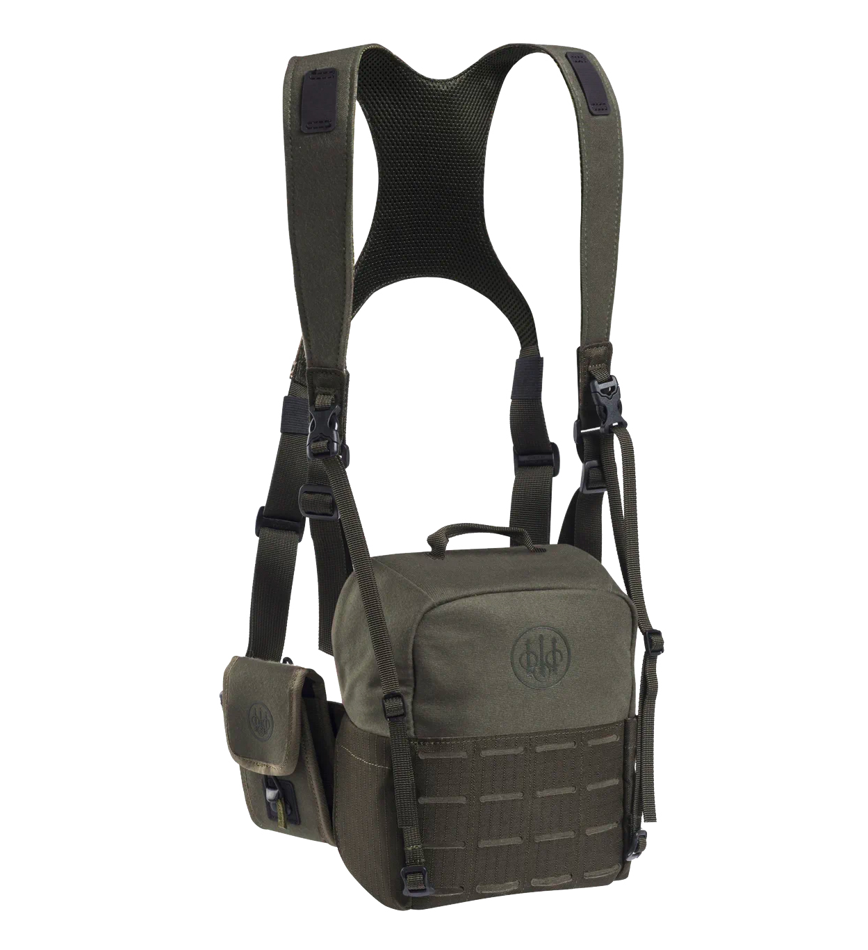 Beretta Modular Binocular Harness Green Moss kikkertsele er designet til at passe til kikkerter i størrelserne 10x42 og 8x56. Selen har fuldt justerbare polstrede skulderstropper, der sikrer komfortabel brug. En enhånds åbningsmekanisme gør det nemt og hurtigt at bruge kikkerten. På forsiden, siderne og undersiden af selen er der laserudskårne MOLLE-paneler, der muliggør fastgørelse af tilbehør. Der er sikkerhedsstropper til kikkerten, der forhindrer, at de tabes. Stødabsorberende EVA-polstring øger komforten og beskytter kikkerten. Selen har også en fleksibel lomme til en laserafstandsmåler med MOLLE-tilslutning.