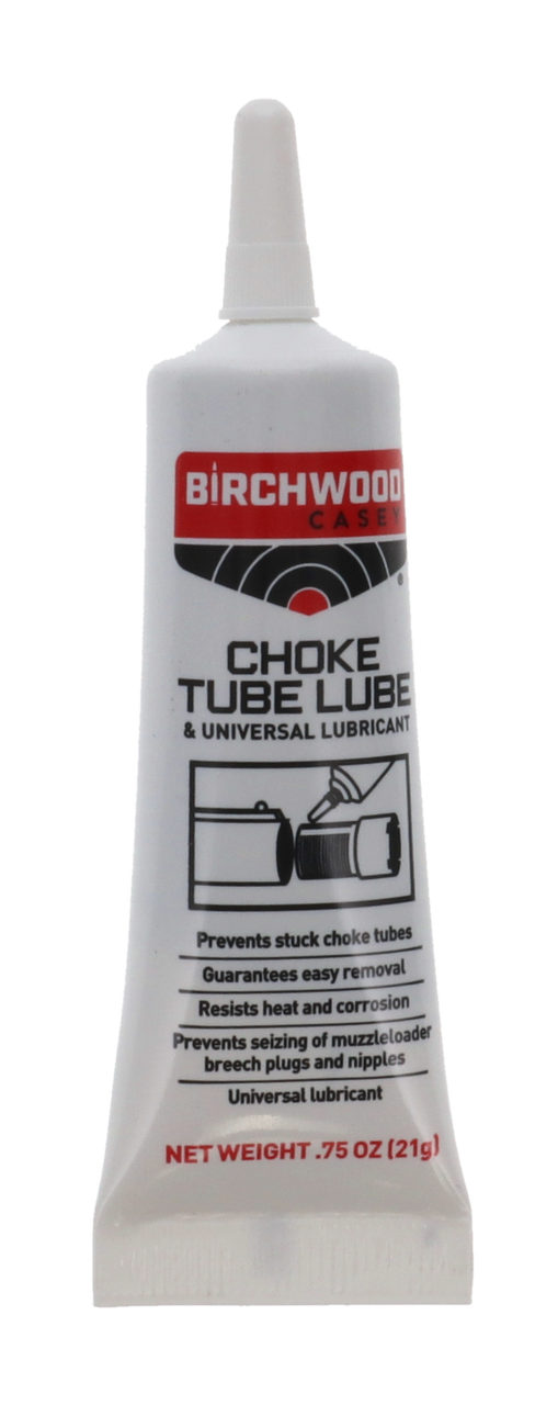 Birchwood Casey Choke Tube Lube 0,75oz forhindrer fastlåsning af chokerør, som kan skyldes korrosion, højt tryk fra stålhagl, ekstreme temperaturer og gentagne skud. Det tåler varme og forhindrer fastlåsning ved temperaturer op til 2000°F (1093°C).