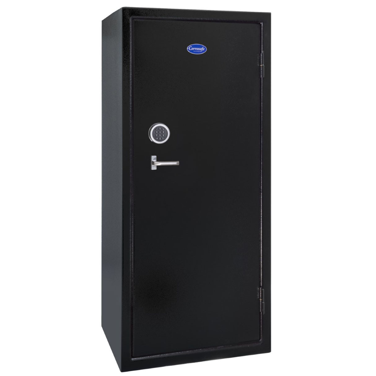 Corrosafe-våbenskabe, fremstillet af 4 mm tykt stålplade, er også pengeskabe. Selv det mindste vejer 125 kg. Der er ingen grund til at bekymre sig om opbevaring af nøgler eller risikoen for, at de falder i de forkerte hænder, hvis man vælger en sikker kodelås til Corrosafe-våbenskabet. Små genstande og ammunition kan opbevares på den øverste hylde samt i opbevaringsrummene på døren. Bunden har en polstring, der beskytter våbnenes kolber mod ridser. Corrosafe-våbenskabet er også en pålidelig opbevaringsløsning til andre værdigenstande i hjemmet og på kontoret. Hvis skabet bruges til opbevaring af virksomhedens dokumenter, er købet fradragsberettiget i virksomhedens skat.
