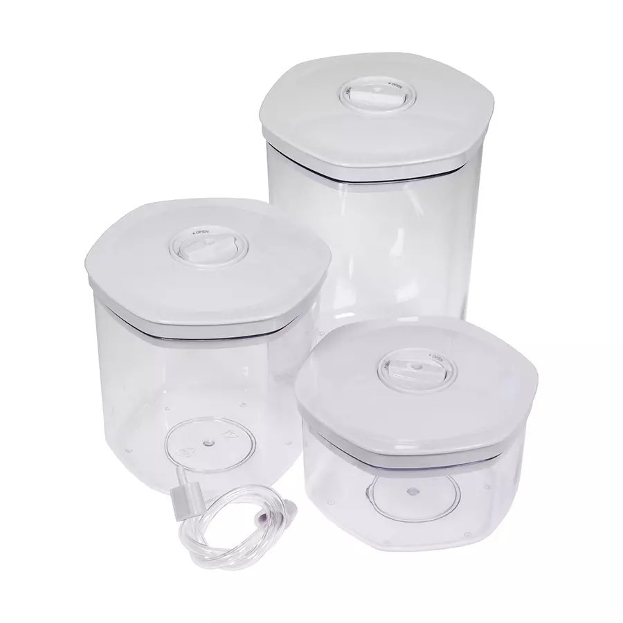 Finnvacuum Vakuumbeholdersæt 3-delt er specielt designet til brug med Finnvacuum vakuumpakkere. Sættet indeholder tre beholdere i forskellige størrelser: 700 ml, 1400 ml og 2000 ml. Sættet inkluderer også en universel sugeslange. Beholderne er ideelle til opbevaring af tørvarer, væsker og supper i køleskabet. De er også yderst praktiske til hurtig marinering af kød, fjerkræ og fisk ved hjælp af vakuum, hvilket gør marineringen mere effektiv på få minutter. Beholderne tåler opvaskemaskine, men låget gør ikke.
