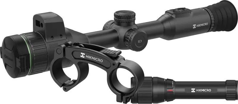 Kernen i pakken er HIKMICRO Alpex A50EL 4K Tube Scope LRF, som har en 3840 x 2160 pixel CMOS-billedsensor, en lysstærk 50 mm linse med justerbar blænde (F1.2 - F2.5) og en 0,49 tommer OLED-skærm med 1920 x 1080 opløsning. Den indbyggede laserafstandsmåler op til 1000 meter og ballistiske beregninger hjælper med at justere sigtepunktet i forhold til kuglefaldet, hvilket forbedrer præcisionen på forskellige skudafstande. Sigtekikkerten har flere sigtekors- og farveindstillinger, så den kan tilpasses til det specifikke våben- og patronkombination.