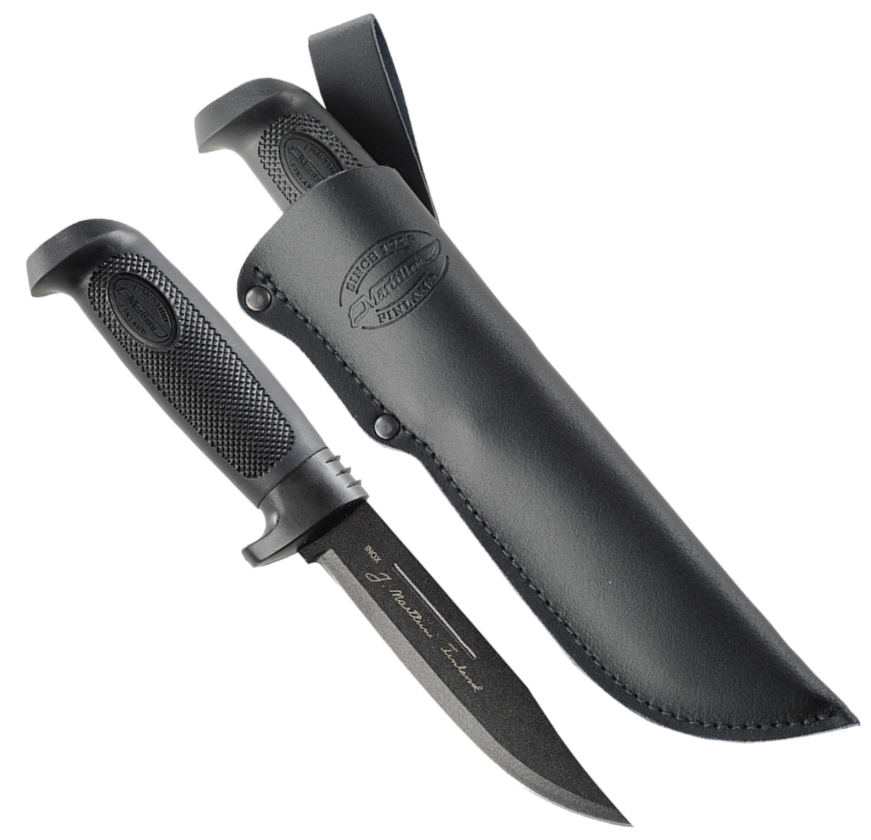 Marttiini Sissipuukko - skovmandens bedste ven! Sissipuukkoens formål er at tilbyde så mange funktioner som muligt i én pakke. Med den robuste kniv kan du flå byttet, snitte spåner og kløve brænde. Denne kniv er helt sort og har ingen dekorationer.