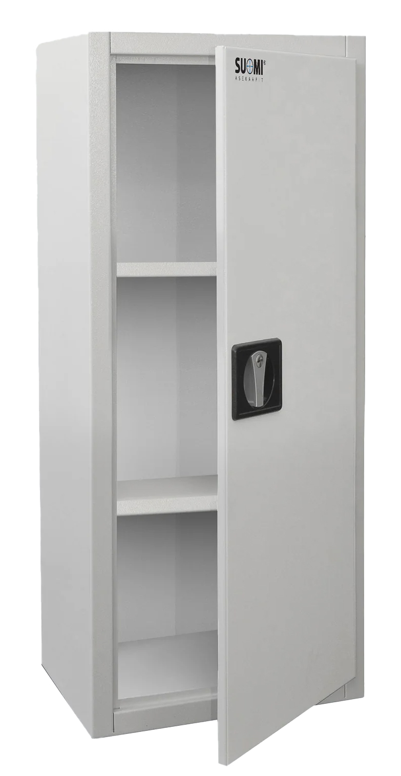 Suomi Ammo L patronkasse er beregnet til opbevaring af ammunition til skydevåben. Den finske våbenlov kræver, at våbenejere opbevarer ammunition i et aflåst skab. Det aflåselige Ammo L-patronkasse er fremstillet af 1,5 - 2 mm stålplade og har monteringshuller til fastgørelse af skabet. Monteringsskruer medfølger også i leveringen. Skabet har to justerbare hylder. Overfladerne er færdigbehandlet med hvid (RAL 9010) pulverlakering.