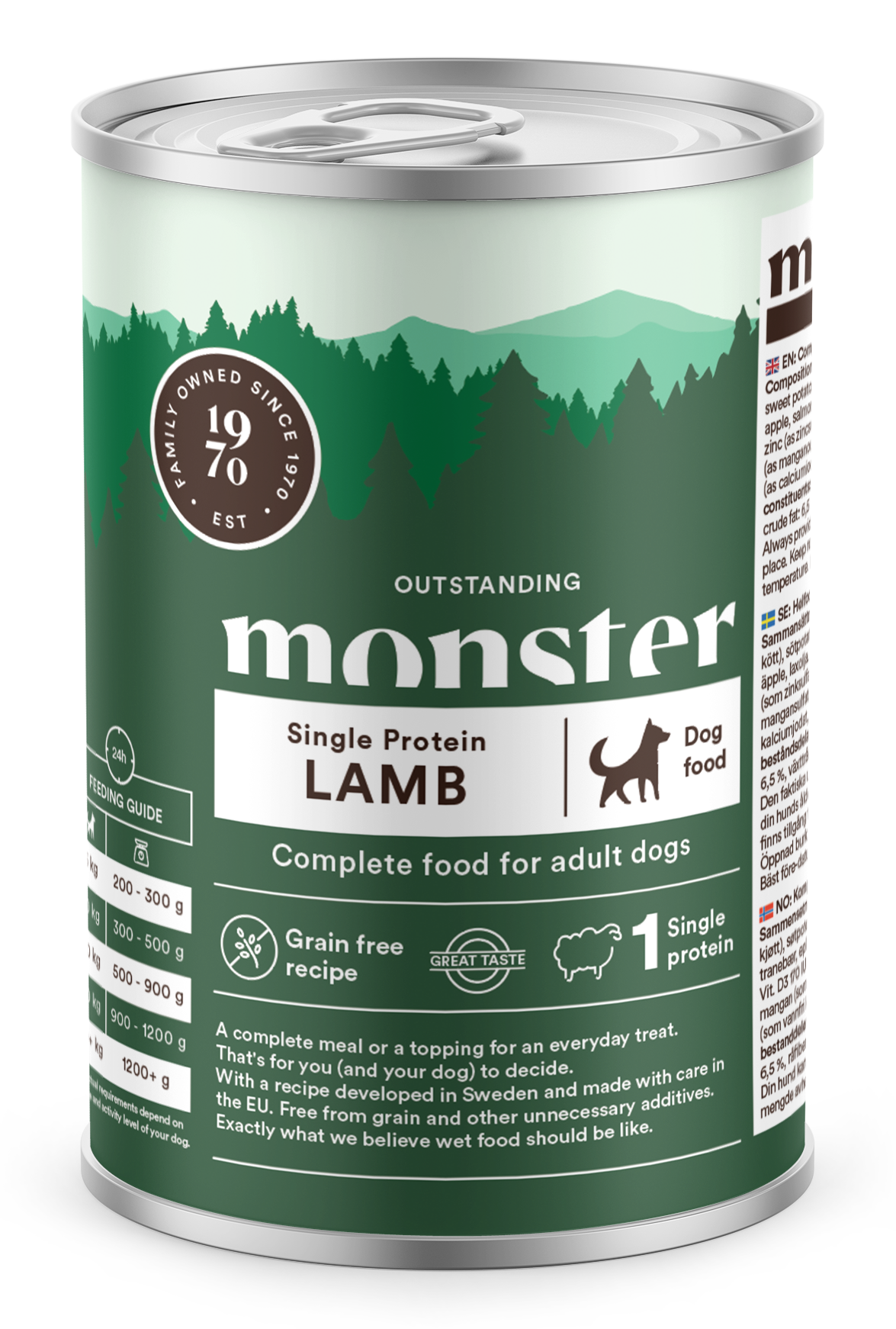 Monster Dog Adult Single Lamb 400g er en 100% kornfri dåsemad, der indeholder masser af sundt lam. Kan bruges enten som fuldfoder eller som en lille luksus i hverdagen. Produktet er udviklet i Sverige og fremstillet af nøje udvalgte råvarer – uden unødvendige tilsætningsstoffer!