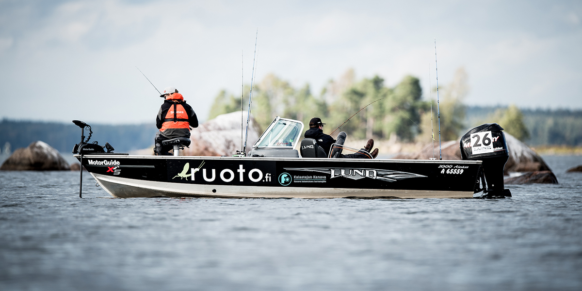 Billedet viser Ruotos team under PredatorMasters fiskeserie 2022. Båden er en Lund 2075 Pro-V, årgang 2015, som stadig bruges aktivt af Ruotos personale.
