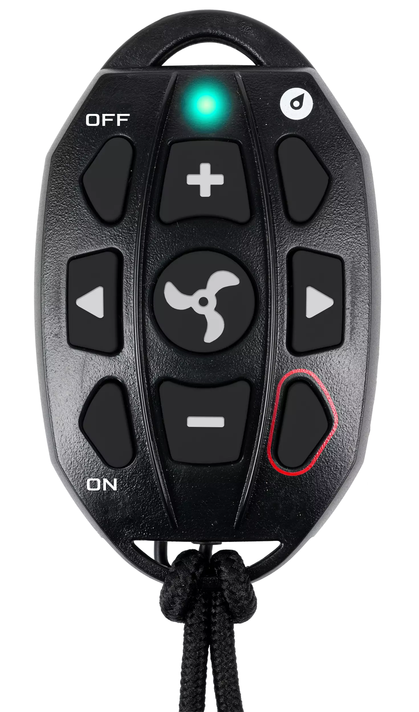 Fjernbetjeningen er regntæt, hvilket sikrer dens funktionalitet selv under udfordrende vejrforhold. Der medfølger en halsrem og et bælteklips, som gør det nemt at transportere og bruge fjernbetjeningen. Øverst på fjernbetjeningen er der en LED-indikator, der viser motorens funktioner.