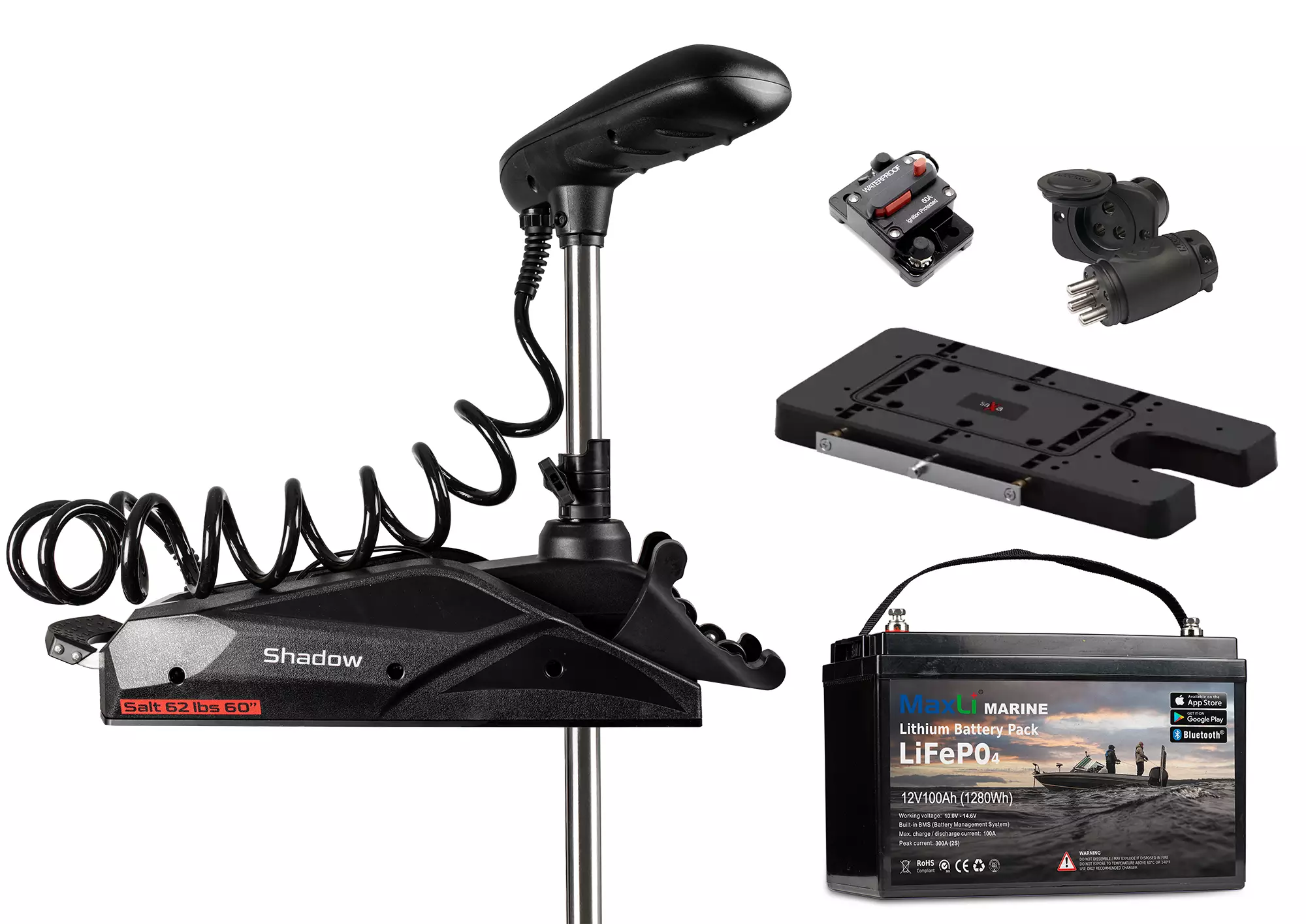 Saxa Shadow Pro 62lbs 60'' + MaxLi Lithium er den perfekte pakke, der indeholder alt, hvad du har brug for til effektiv og langvarig brug af en bovmotor. Denne pakke kombinerer Saxa Shadow Pro bovmotor, det moderne MaxLi Marine lithiumbatteri, Saxa Shadow Quick Release Bracket, en 60A vandtæt automatisk sikring samt Marinco's kvalitetsstrømstik.