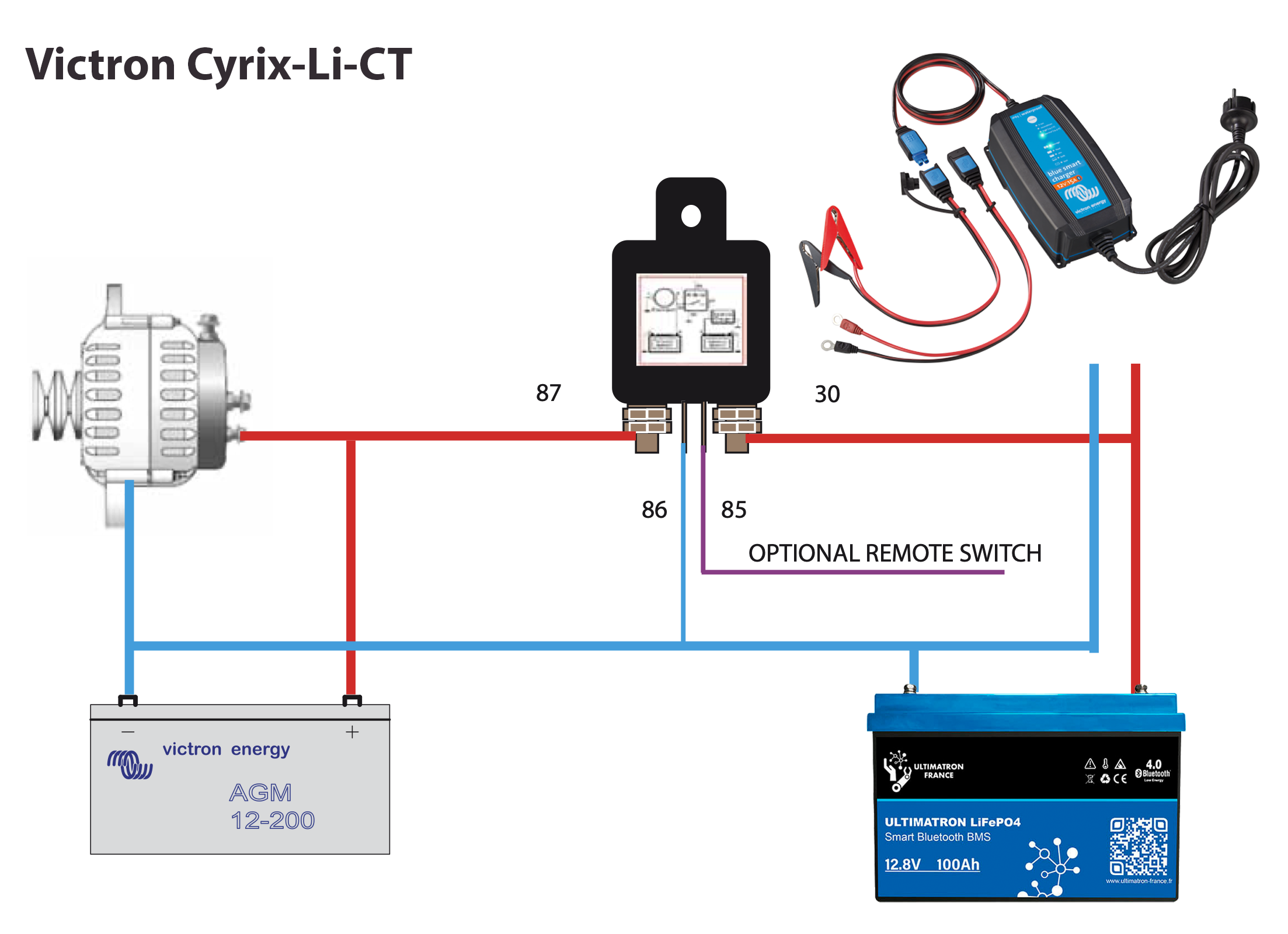 Victron Cyrix Li-CT - er designet til eksempelvis bådens start AGM-batteri og bovpropellens eller elektronikens LiFePo4 lithiumbatteri. Det forstår, at lagerbatteriet er et AGM-batteri, og målbatteriet er et LiFePo4 lithiumbatteri. Det er også velegnet til autocampere, hvor fritidsbatteriet er et LiFePo4 lithiumbatteri.