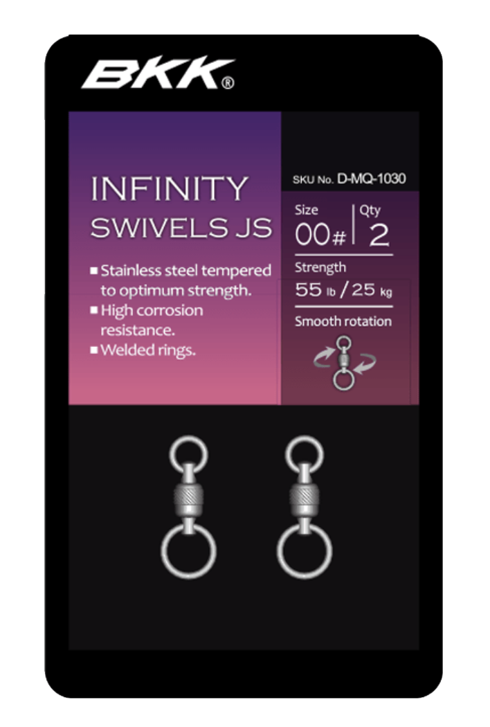 BKK Infinity Swivel JS - er en opgraderet Infinity Swivel designet til at rigge dine jigs. Den har alle de egenskaber, som den originale Infinity Swivel har, for at modstå korrosion, give styrke og holdbarhed og undgå alle torsionskræfter. Derudover er en af ringene større for at give ekstra bevægelsesfrihed til både assistkrogene og jiggen i din jigging-præsentation, hvilket forbedrer din hook-up rate.