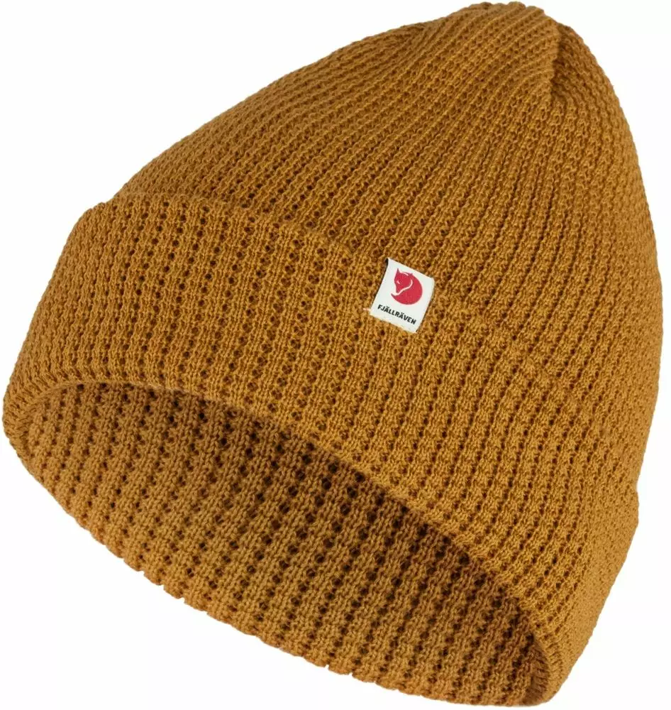 Fjällräven Tab Hat er en blød og behagelig strikhue, der er fremstillet af genanvendt polyester. Huen har et smukt vaffelstrikmønster og en bred, opfoldelig kant. Den har også et lille tekstillogo. Materialet er designet til at transportere fugt væk fra huden og tørre hurtigt, hvilket gør den til et fremragende valg både til hverdagsbrug og fjeldvandringer.