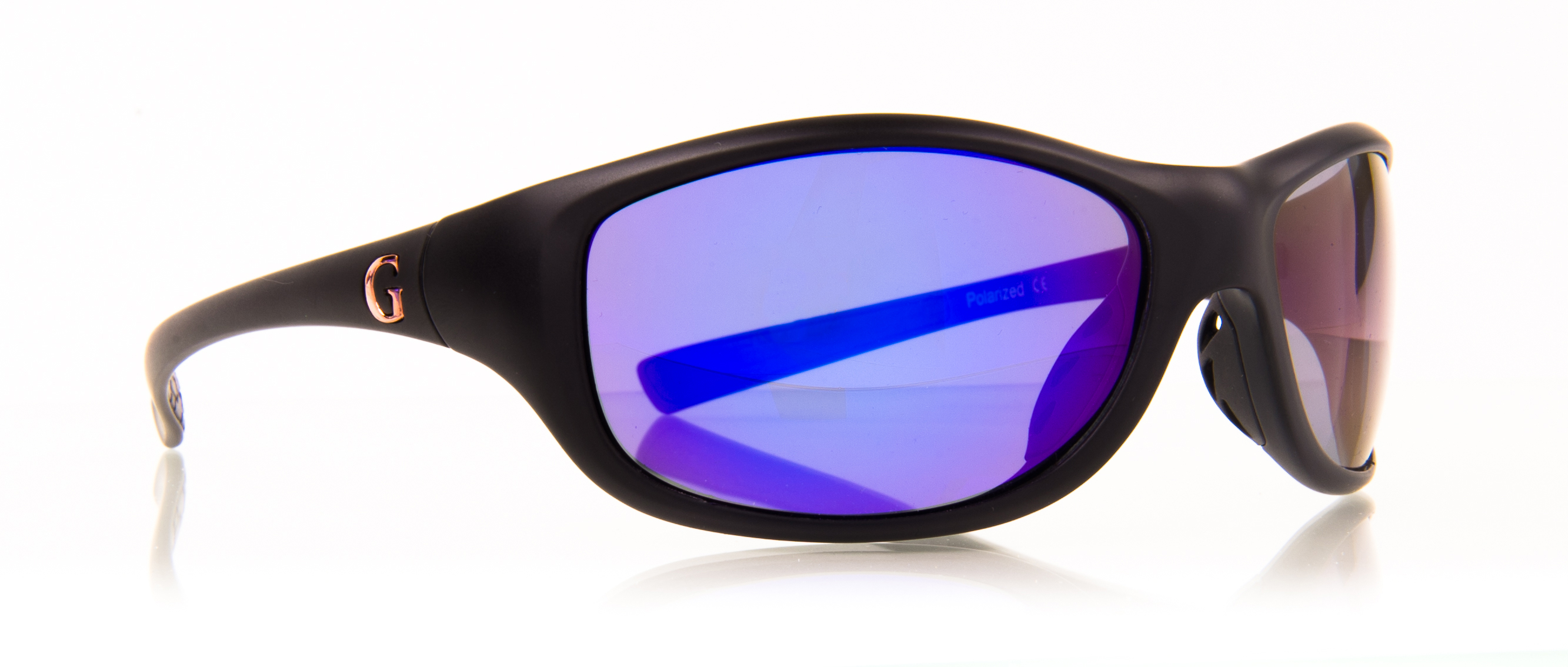 Grimman Brook Black / Blue Revo Grimman Brook solbrillerne har en slank profil og et design, der sikrer en tæt pasform på ansigtet. Dette forhindrer effektivt sollys i at trænge ind i brillerne fra siderne eller bagfra. Linserne har en ridsefast belægning og en antirefleksbelægning på indersiden, hvilket forbedrer komforten ved brug.