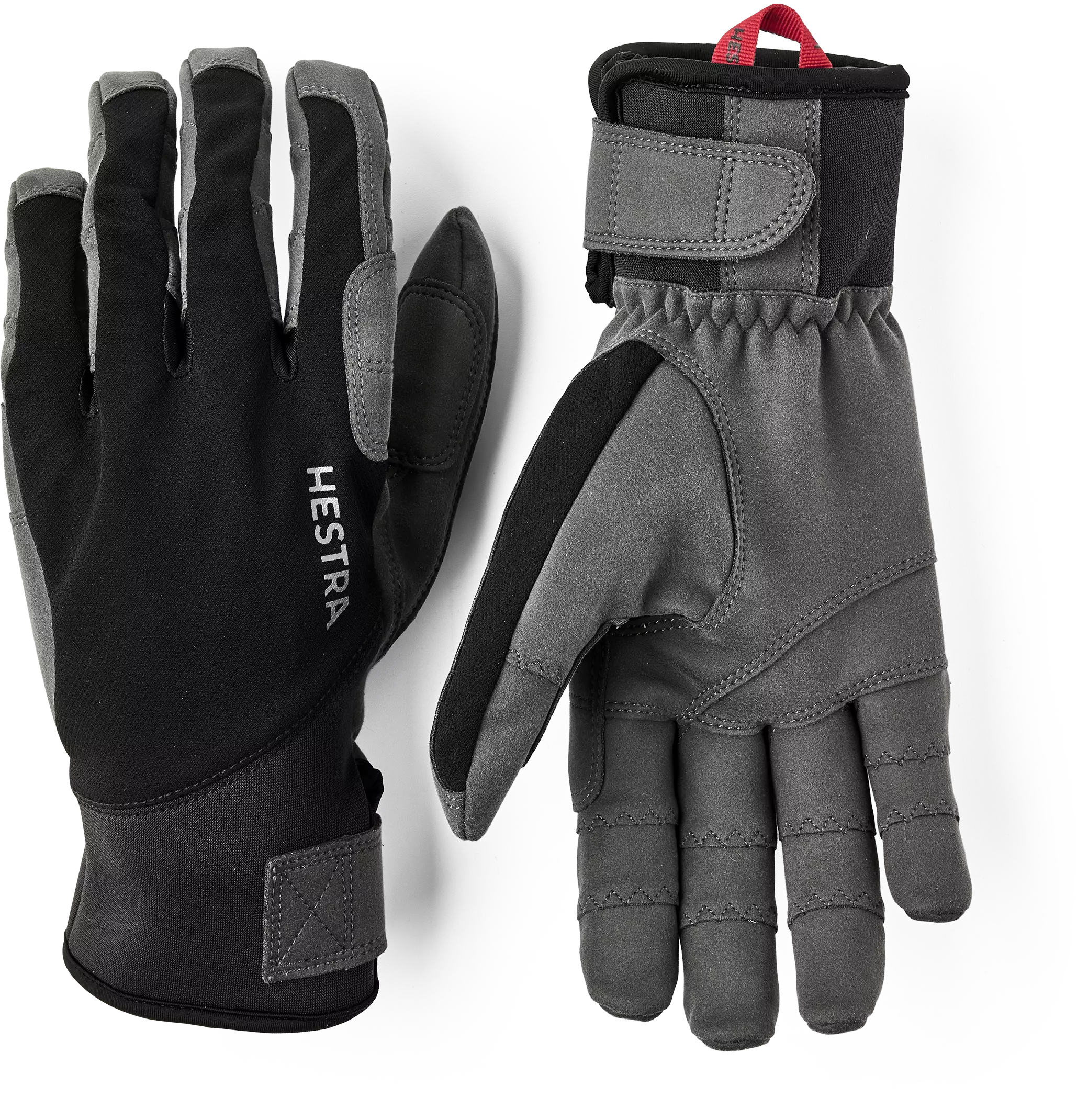 Handskens bagside er lavet af det vindtætte og vandafvisende Hestra Ventus-stof, som er en polyesterblanding. Dette materiale er meget holdbart og egnet til krævende forhold.