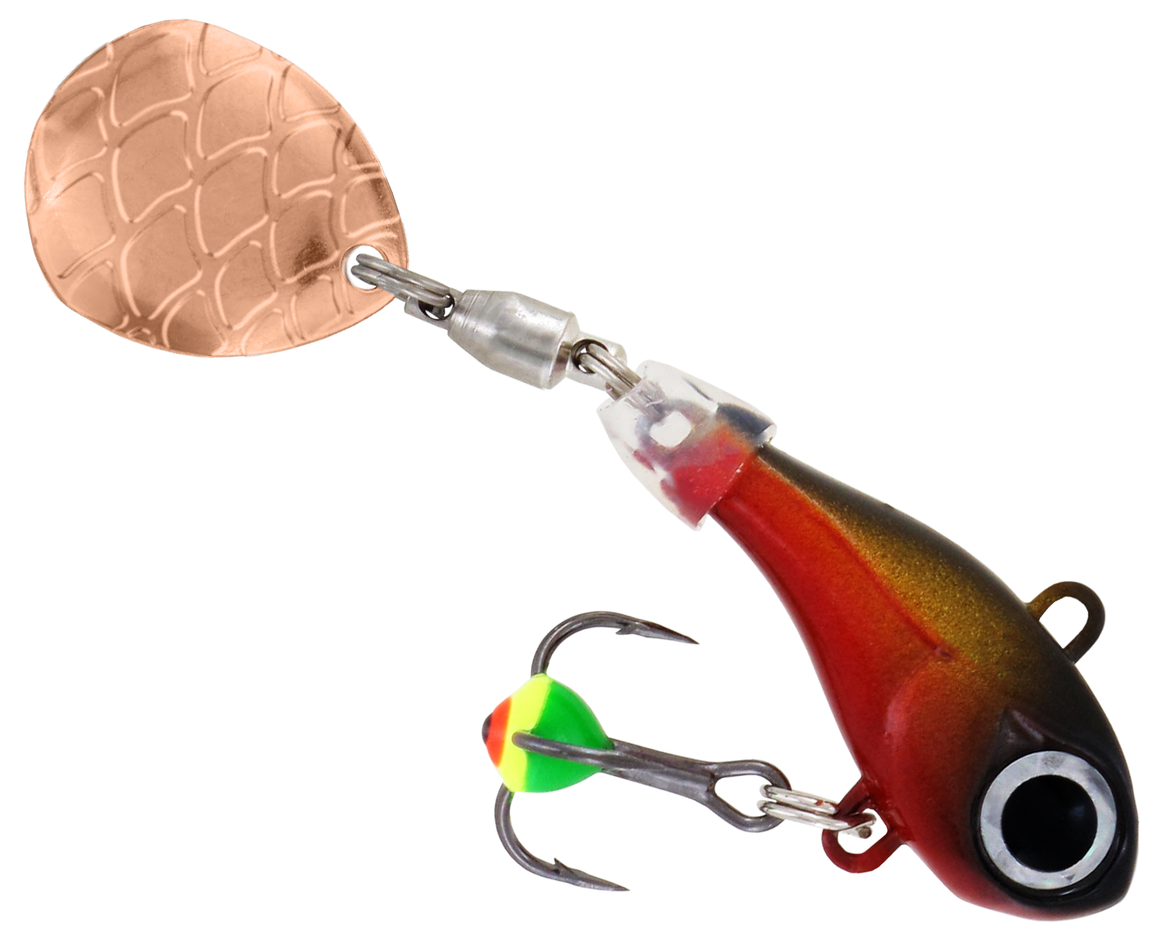 • Appelsinkola UV: En orange-sort kontrastfarve, der har vist sig effektiv til aborrefiskeri. Det kobberfarvede spinnerblad fuldender det afdæmpede helhedsindtryk.