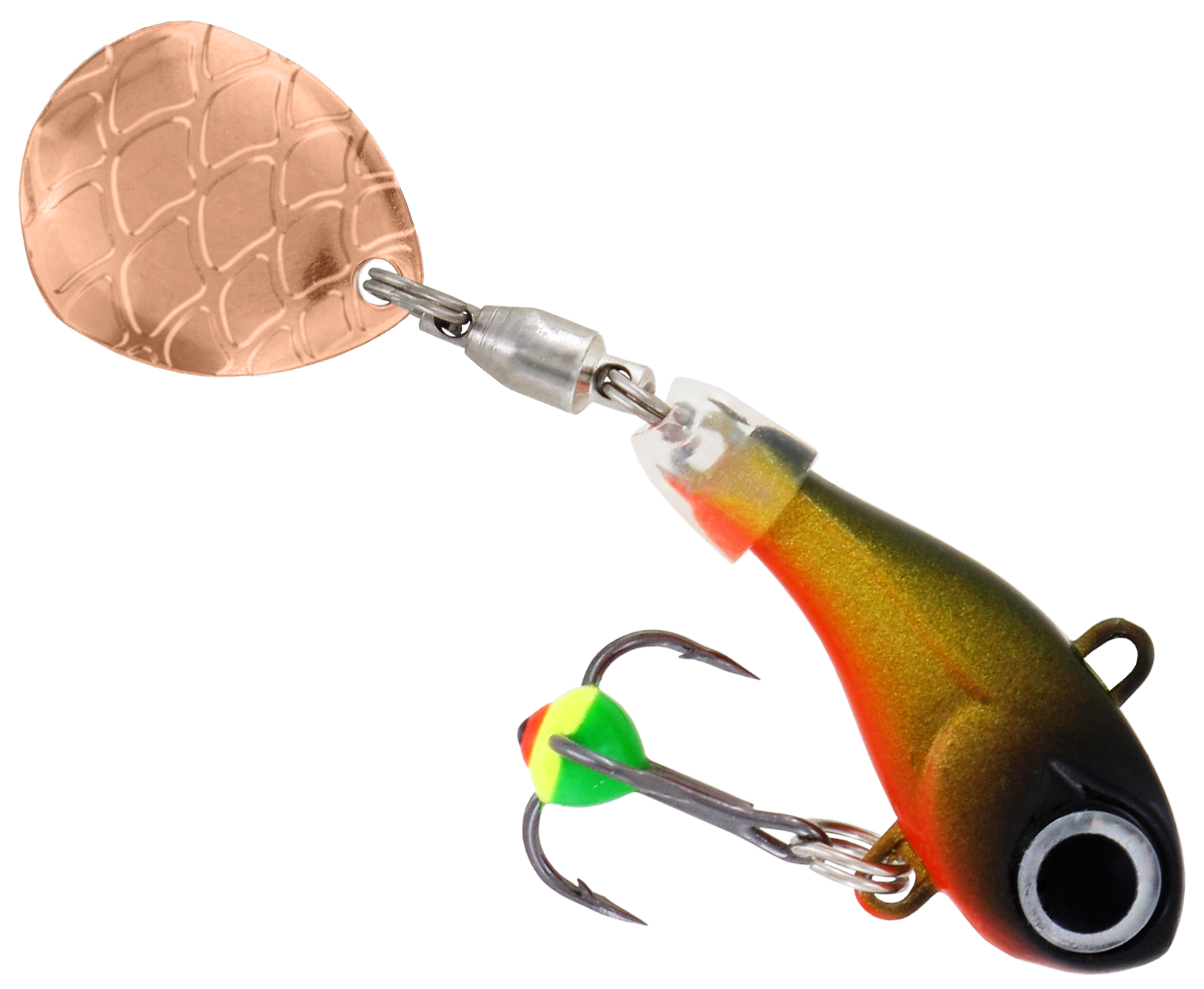• Appelsinkola UV: Den orange-sorte kontrastfarve har vist sig effektiv til aborrefiskeri. Det kobberfarvede spinnerblad fuldender det afdæmpede helhedsindtryk.