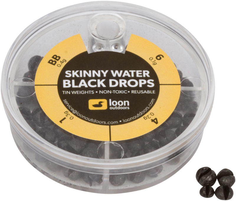Loon Black Drops 4 Division Skinny Water Dispenser - vægtkassette er en fremragende ledsager til den miljøbevidste fluefisker. På mange fluefiskesteder er brugen af traditionelle blyvægte forbudt, og man skal skifte til alternative materialer. Loon Black Drops-vægtene er lavet af tin og er fuldstændig giftfri for miljøet. Derudover er de let genanvendelige på grund af deres form.