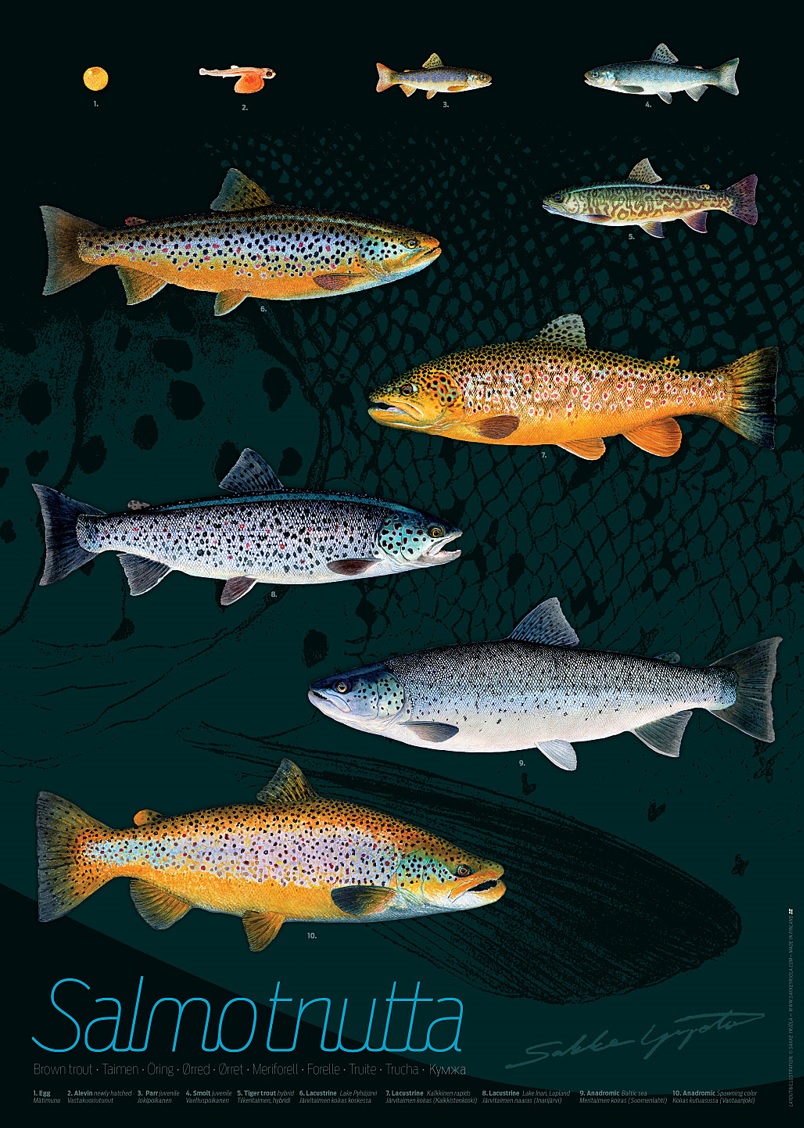 Sakke Yrjölä Salmo trutta, Variationer af ørred -plakaten præsenterer ørredens mangfoldighed. Plakaten viser ørredens livscyklus fra æg til gydedragt og inkluderer også en hybridform mellem ørred og bækørred, "tigerørreden". Plakaten er trykt i Finland og leveres pakket i et paprør. Størrelsen er 50 x 70 cm.