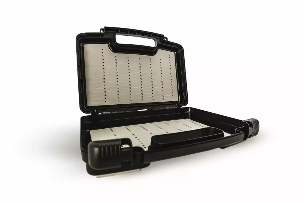Æskens rummelige indre gør det muligt at opbevare store fluer, og det udvendige rillede skum giver en praktisk plads til hurtige flueskift. Den vandtætte lukkemekanisme beskytter fluerne mod fugt, og den glidende låsemekanisme forhindrer æsken i at åbne utilsigtet.